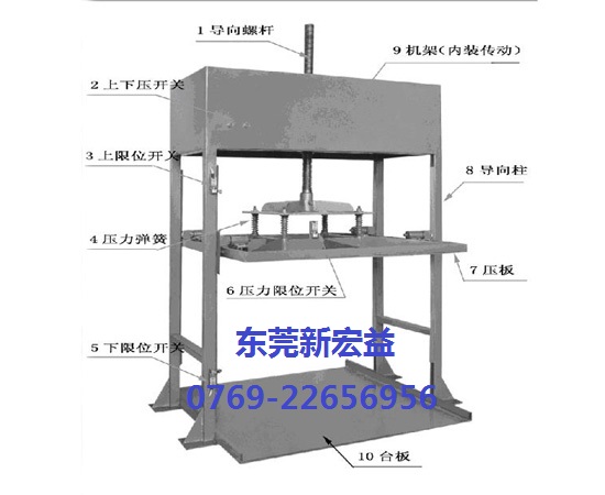 本机主要由机架、压板和传动三部分组成。通过传动装置控制导向螺杆1和压板7上下运动,和台板10配合达到压平作用。压力限位开关6控制压力,上/下限位开3/5关保护有效的工作行程。压力弹簧4控制压平的力度。